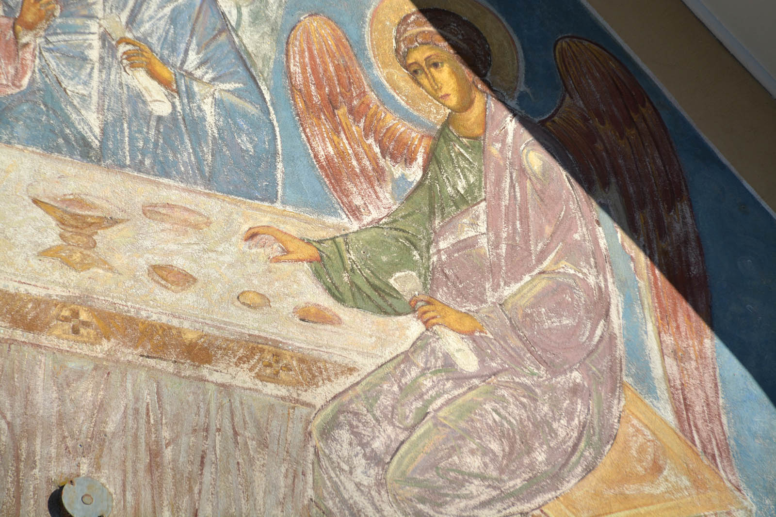 The first damaged fresco was the Old Testament Trinity, located above the main entrance of the Church. The second was the Resurrection of Christ on the eastern side of the bell tower.